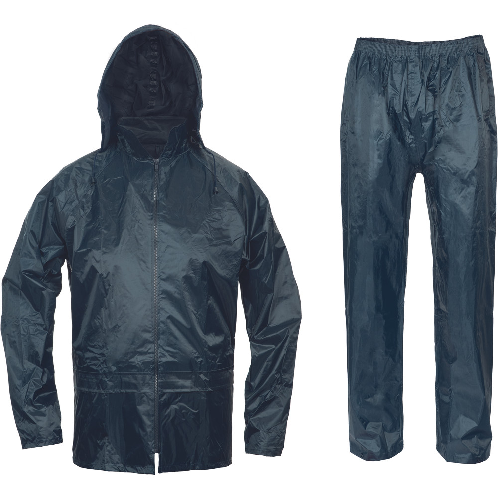Kétrészes esővédő öltöny csuklyával, lehegesztett varratokkal, praktikus tartóban.